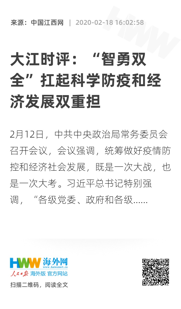 2月12日,中共中央政治局常务委员会召开会议,会议强调,统筹做好疫情防控和经济社会发展,既是一次大战,也是一次大考。习近平总书记特别强调,“各级党委、政府和各级领导干部要扛起责任、经受考验,既有责任担当之勇、又有科学防控之智”。