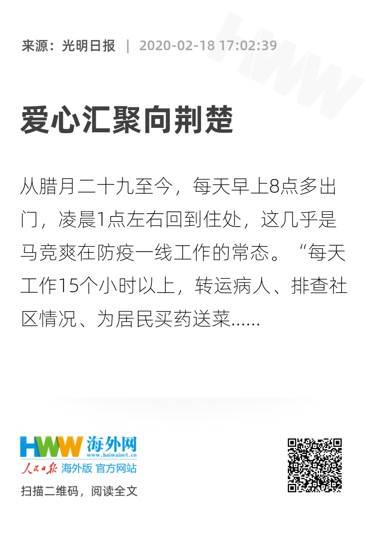 从腊月二十九至今,每天早上8点多出门,凌晨1点左右回到住处,这几乎是马竞爽在防疫一线工作的常态。“每天工作15个小时以上,转运病人、排查社区情况、为居民买药送菜,全天24小时手机开机接听求助电话。”武汉疫情防控工作刚开始,90后“选调生”马竞爽便主动请求“下沉”到基层社区,做一名抗疫志愿者。