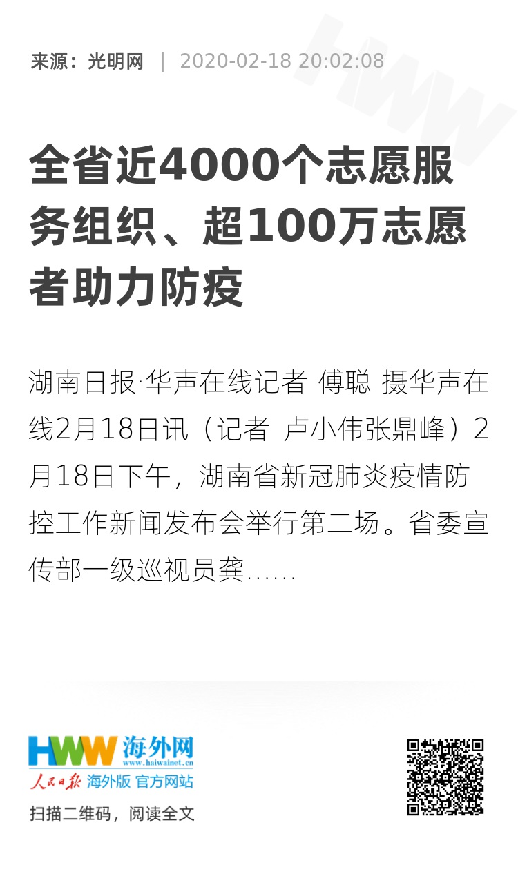 华声在线2月18日讯(记者 卢小伟张鼎峰)2月18日下午,湖南省新冠肺炎疫情防控工作新闻发布会举行第二场。省委宣传部一级巡视员龚爱林介绍志愿者服务全省疫情防控工作。新冠肺炎疫情出现以来,全省各市州、县(市区)文明办依托各地志愿服务组织、新时代文明实践中心(所、站)、街道、社区、单位等,组织广大志愿者开展志愿服务,全省近4000个志愿服务组织、超100万志愿者助力防疫。