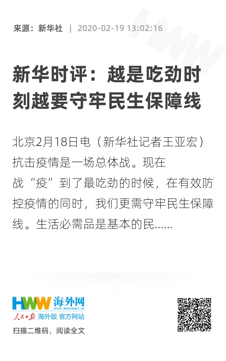 新华社北京2月18日电(新华社记者王亚宏)抗击疫情是一场总体战。现在战“疫”到了最吃劲的时候,在有效防控疫情的同时,我们更需守牢民生保障线。