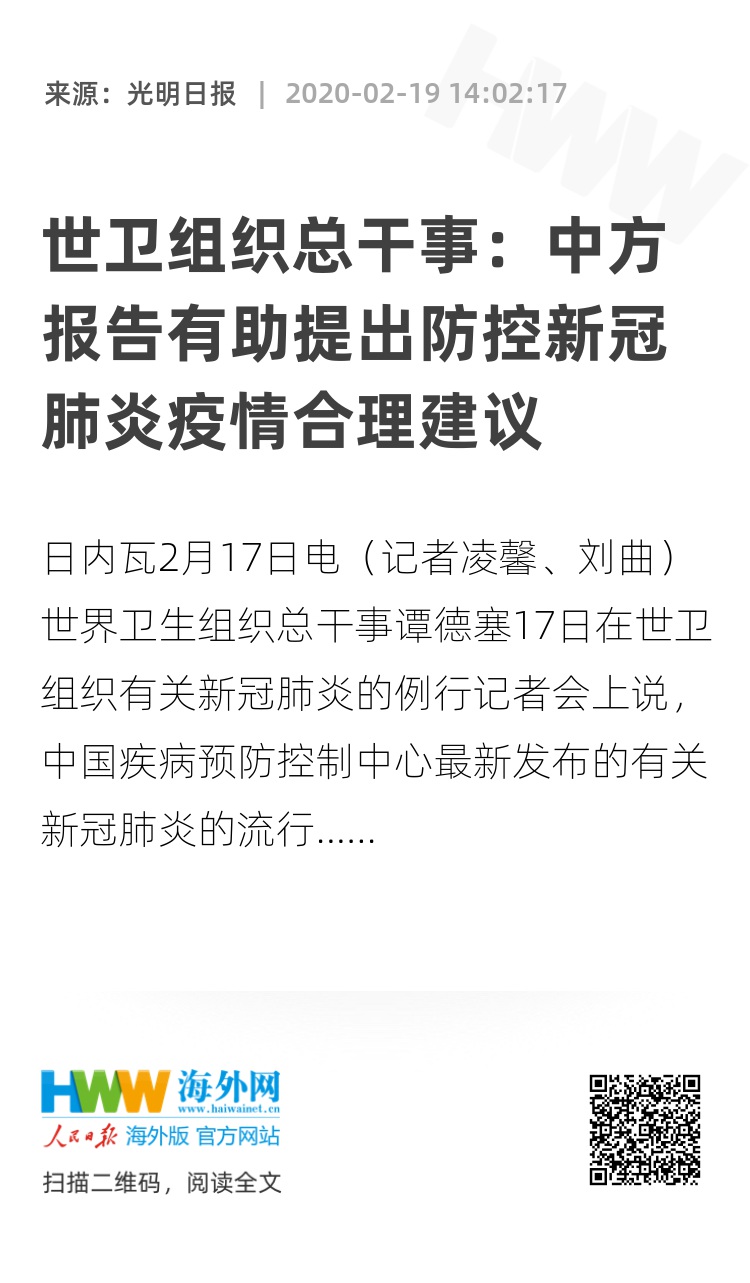 新华社日内瓦2月17日电(记者凌馨、刘曲)世界卫生组织总干事谭德塞17日在世卫组织有关新冠肺炎的例行记者会上说,中国疾病预防控制中心最新发布的有关新冠肺炎的流行病学报告,为世卫组织向各国提出防控疫情的合理建议提供了帮助。