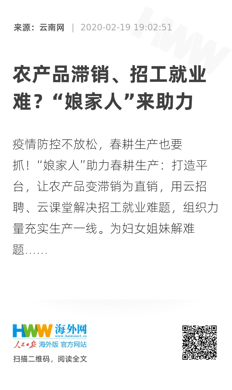 突如其来的疫情阻断了物流运输,南京八卦洲约6万斤芦蒿面临滞销困境,当地妇女向“娘家人”求助。在妇联组织帮助对接直销平台后,短短两天,芦蒿售出3万余斤。在江苏省最大的草莓种植基地溧水区,短短4天的平台销售让草莓大户曹竹香喜出望外。她说:“一直担心草莓卖不出去,钱收不回来。真的很感谢妇联组织,解决了我们的大问题。”各级妇联组织正一同行动,了解种植户需求、核实各基地情况、对接申报平台,为服务农村创业女性奔走。