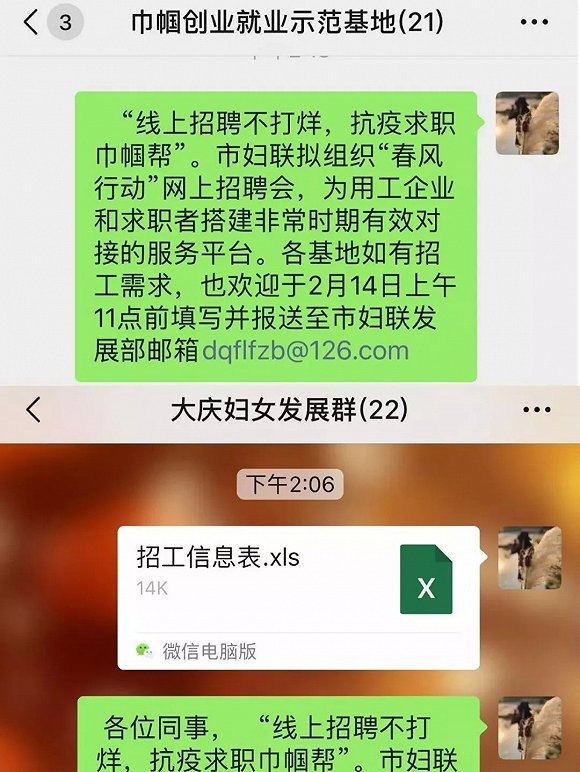 大庆市妇联借助直播平台、公众号、微信群等,开办“巾帼公益直播大讲堂”“咚咚家服课堂”“手工编织协会公益讲堂”等线上课堂,上线“农家女微课堂”“巾帼微课堂”等线上专栏,全市开展手工编织、家政服务、礼仪茶艺等实用课程培训近百期。为帮助企业招工用工和妇女在疫情结束时顺利就业,开展“线上招聘不打烊,抗疫求职巾帼帮”活动,为用人单位和求职人员搭建供需对接平台。