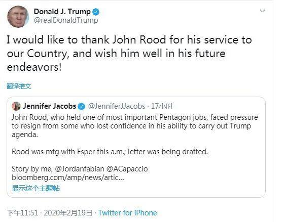 特朗普写道,“我要感谢约翰⋅鲁德为我们国家所做的服务,并祝他未来事业顺利。”特朗普在这条推文下面还转载了彭博社一则消息链接,该消息指出,鲁德“是在一些人的施压下离开的,在执行特朗普政策能力方面,这些人失去了对鲁德的信心”。