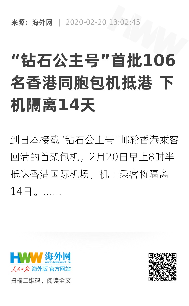 “钻石公主”号邮轮上人员19日隔离期满,新型冠状病毒的最新检测结果为阴性且没有发热症状者陆续获准下船,当天约有500名乘客下船。20日,特区政府派包机撤离中国乘客前往香港。