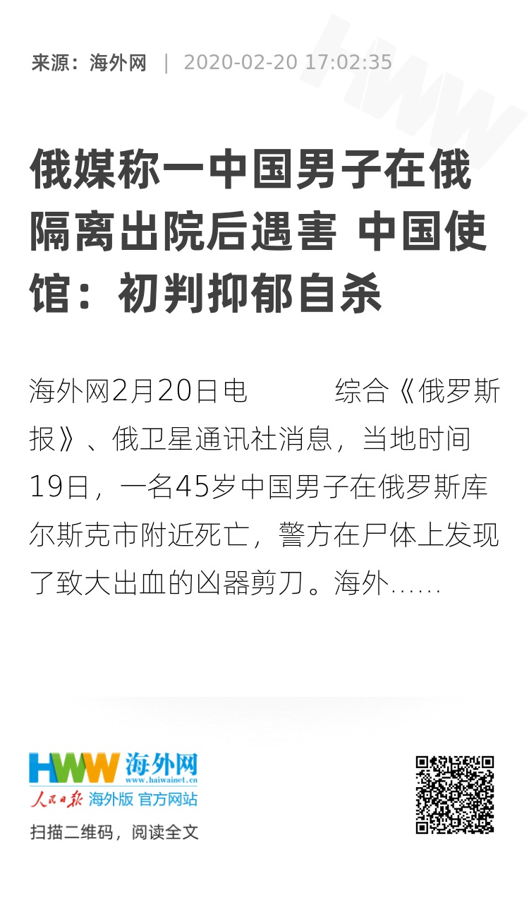 海外网2月20日电 综合《俄罗斯报》、俄卫星通讯社消息,当地时间19日,一名45岁中国男子在俄罗斯库尔斯克市附近死亡,警方在尸体上发现了致大出血的凶器剪刀。海外网致电中国驻俄罗斯大使馆求证,使馆人员表示,警方初步判定为抑郁自杀。
