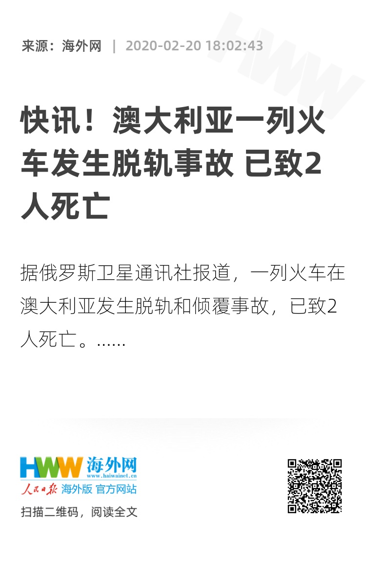 报道称,据澳大利亚交通安全局说法,这列火车上有160名乘客。据澳大利亚当地媒体报道,维多利亚州警方在一份声明中称,事故发生于墨尔本以北45公里处的瓦兰镇附近,造成2人死亡,多人受伤。警方表示,仍有几名乘客被困在火车里。目前,墨尔本和悉尼之间的铁路交通已暂停。