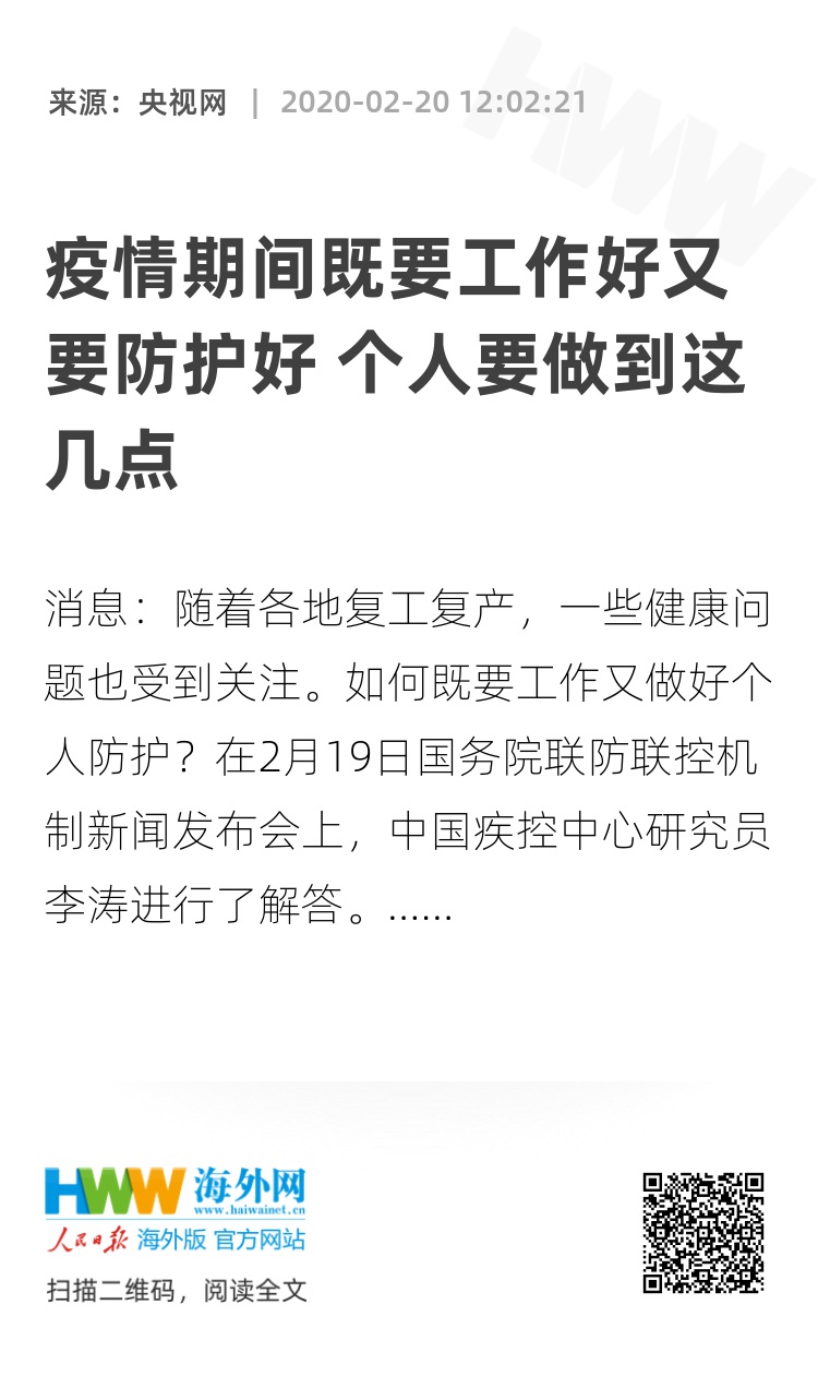 央视网消息:随着各地复工复产,一些健康问题也受到关注。如何既要工作又做好个人防护?在2月19日国务院联防联控机制新闻发布会上,中国疾控中心研究员李涛进行了解答。