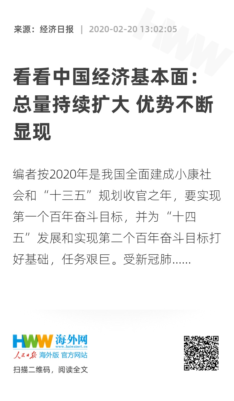 中国经济是一片大海,而不是一个小池塘。大海有风平浪静之时,也有风狂雨骤之时。狂风骤雨可以掀翻小池塘,但不能掀翻大海。我们坚信,疫情对中国经济的影响是阶段性、暂时性的,不会改变中国经济长期向好的基本面。随着经济总量的持续扩大,抵御短期冲击、应对风险挑战的能力进一步增强,中国经济仍将继续保持稳中向好、长期向好的基本趋势。2020年,我们必须继续深入贯彻落实中央决策部署,坚持新发展理念,坚持以供给侧结构性改革为主线,坚决打好三大攻坚战,保持经济运行在合理区间,确保经济实现量的合理增长和质的稳步提升,绝对不能因为内外环境复杂多变和经济短期波动,就迷失了方向、迷失了主线。(记者 林火灿)