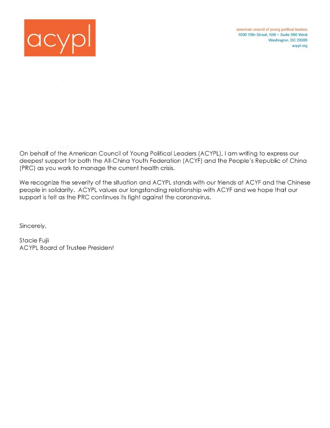 我谨代表美国青年政治领袖理事会,表达我们对全国青联及中国应对这场健康危机的有力支持。 我们认识到当前疫情形势的严重性,坚定地与全国青联的朋友们及中国人民站在一起。美青理会珍视与全国青联的长期交往关系,希望中国在抗击疫情的战斗中能够感受到我们的支持。