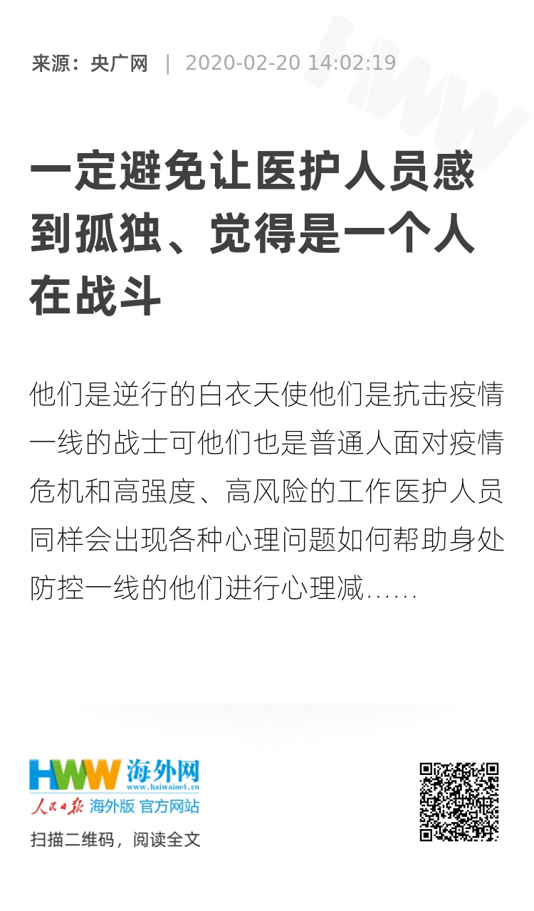 冯强:“到目前来看,我们医护的情绪相对还是比较稳定的,可能也是刚开始,大家都还是很有劲头和专注力的。如果持久的话,其实就需要我们心理健康员及时地给医护(人员)进行一些心理调适。比如说,举办一些小组讨论,或者是网络视频小组讨论,大家都分享一下自己的感想,然后给予相互的一些反馈,起到相互支持的作用,这个是比较重要的。我还是要强调一点,一定避免让我们的医护感到孤独,或者是觉得一个人在战斗,这个时候他们就很容易疲惫,很容易懈怠。一定要有一种连接,一种团队的支持,或者是后方的支持。比如说,后方的医院的同事、领导不断地去支持,形成一个社会支持网络,就会对我们医护人员的精神健康起到很大的支撑作用。”