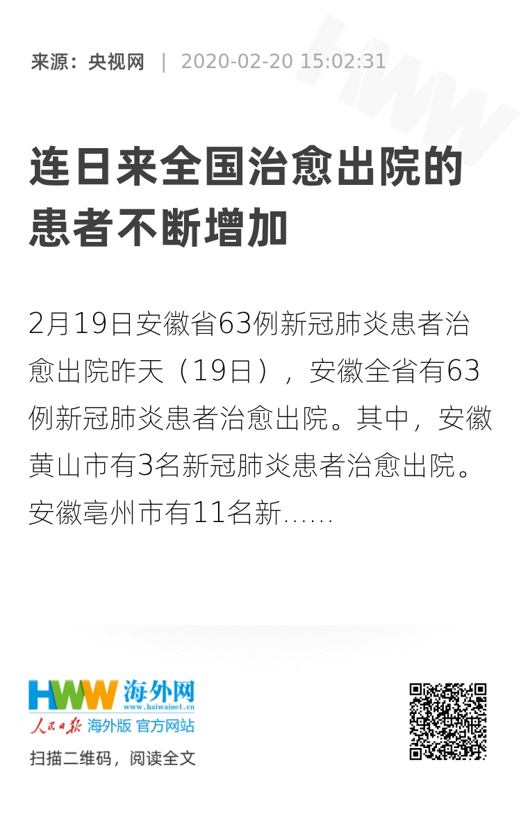 2月19日安徽省63例新冠肺炎患者治愈出院