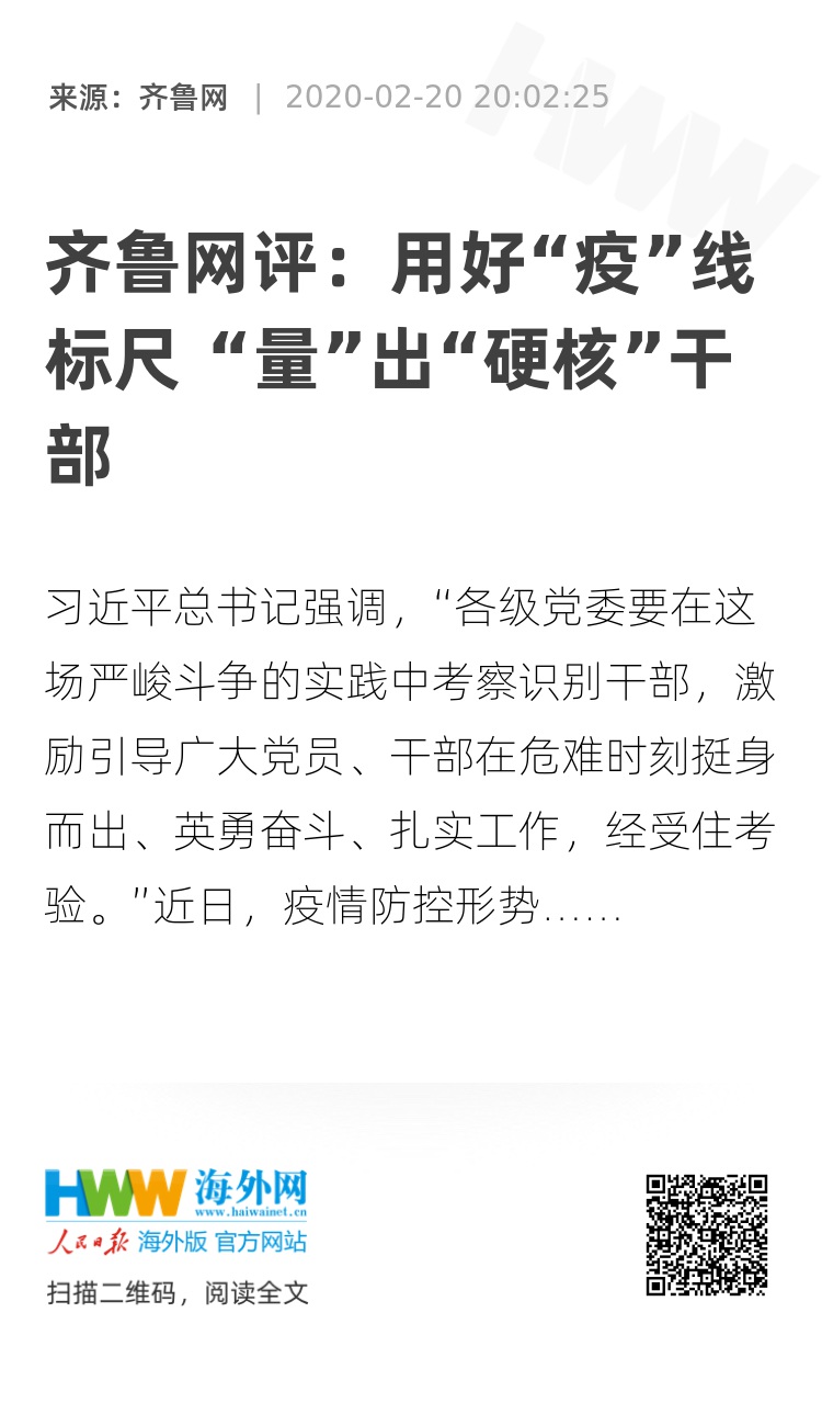 在群众口碑中“量”出干部的为民情怀。新冠肺炎疫情防控涉及每个人的生命安全和身体健康,人民群众十分关心关注。在这场与疫情短兵相接的严峻战“疫”中,作为人民群众的“主心骨”,党员干部的表现如何,直接影响疫情防控阻击战的进展,也是线上线下群众关注的焦点。党员干部是否真正将群众切身利益放在心上,将急难险重、纷繁复杂的防控工作做实做细做到位,让被感染者第一时间得到救治,让被隔离者日常生活有更好保障,让广大群众能在生命健康安全得到保护的基础上有更多生产生活便利,群众有现实感受和切身体会。要在群众口碑毁誉中“量”出干部的为民情怀,以特殊时期群众的安全感强不强、满意度高不高为标尺,鼓舞激励广大党员干部当好群众的贴心人和“主心骨”,全力答好维护人民群众生命安全和身体健康的考卷。(文/蔺炳正)