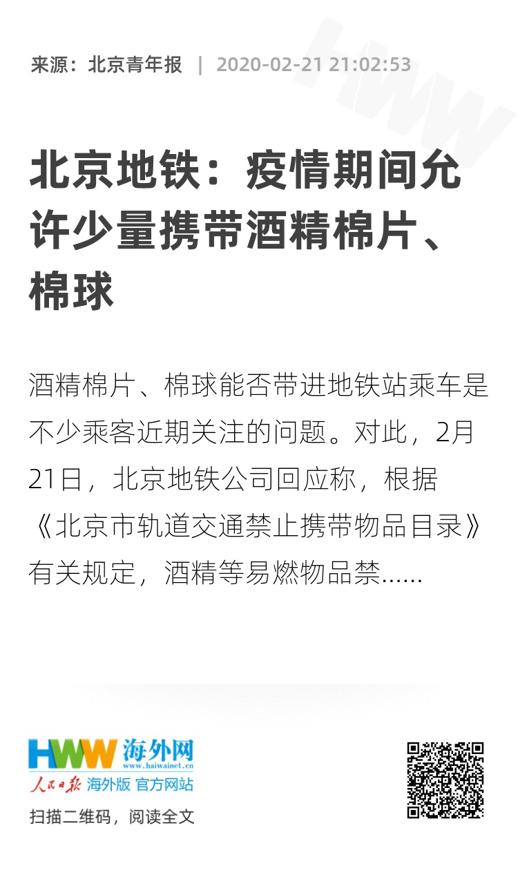 酒精棉片、棉球能否带进地铁站乘车是不少乘客近期关注的问题。对此,2月21日,北京地铁公司回应称,根据《北京市轨道交通禁止携带物品目录》有关规定,酒精等易燃物品禁止带入轨道交通。疫情爆发以来,广大乘客对于携带酒精棉片、棉球的需求较大,经与公安机关协调,疫情期间原则上由工作人员视情况对于少量携带酒精棉片、棉球的乘客予以放行。