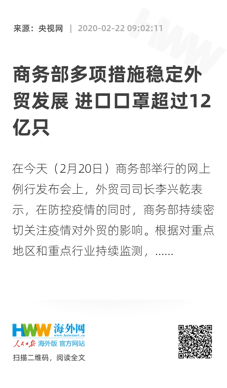 据监测统计,截至今天,各种贸易方式进口口罩已超过12亿只,防护服超过1300万套。其中,59个跨境电商综试区跨境电商平台和企业累计进口口罩超过5000多万只,防护服近100万套。李兴乾表示,医疗物资保障是对进口贸易各环节的一次全方位考验。实践证明,进口链条各环节快速响应、高效运行,总体顺畅有效。