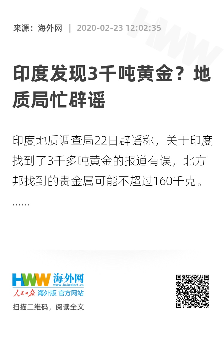 海外网2月23日电 日前,一些印度媒体报道称,地质学家在印度找到了3千多吨的黄金,这超过了印度黄金储量的5倍。不过,印度地质调查局(GSI)22日辟谣称,报道有误,北方邦找到的贵金属可能不超过160千克。