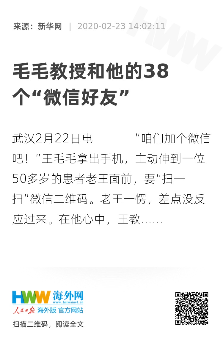 老王一愣,差点没反应过来。在他心中,王教授是火神山医院感染二科一病区副主任医师,从上海来的军医大学的大专家,居然主动加普通患者的微信好友。