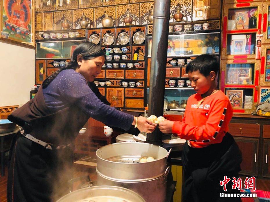 伟玛夺机妻子拉么措和孙子正在准备早饭。 龙江燕 摄