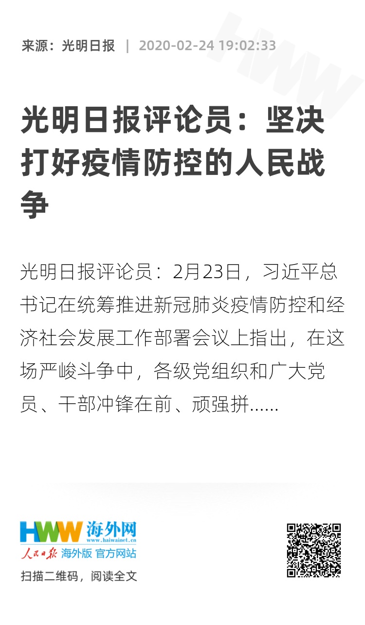 光明日报评论员:2月23日,习近平总书记在统筹推进新冠肺炎疫情防控和经济社会发展工作部署会议上指出,在这场严峻斗争中,各级党组织和广大党员、干部冲锋在前、顽强拼搏,广大医务工作者义无反顾、日夜奋战,人民解放军指战员闻令而动、敢打硬仗,广大人民群众众志成城、守望相助,广大公安民警、疾控工作人员、社区工作人员等坚守岗位、日夜值守,广大新闻工作者不畏艰险、深入一线,广大志愿者等真诚奉献、不辞辛劳,党和国家有关部门和人大、政协以及各人民团体等主动担责,社会各界和港澳台同胞、海外侨胞纷纷捐款捐物,为疫情防控作出了重大贡献。