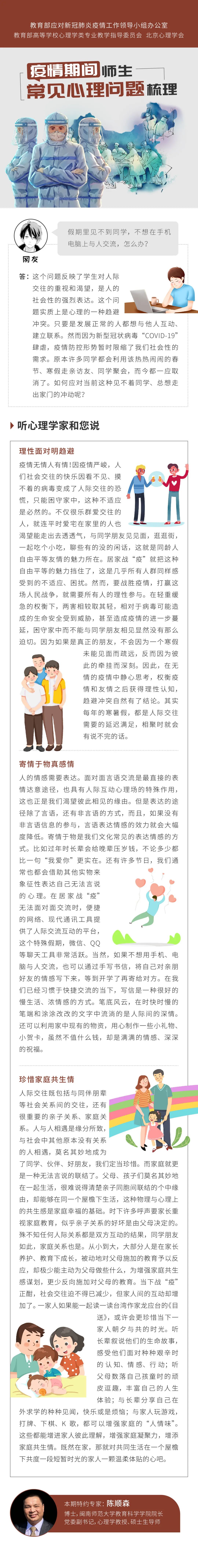 今天,微言教育推出《用“心”战“疫”》第期,随教育小微一起来听辽宁师范大学刘文教授、 闽南师范大学陈顺森教授详解,疫情期间师生常见心理问题如何调整