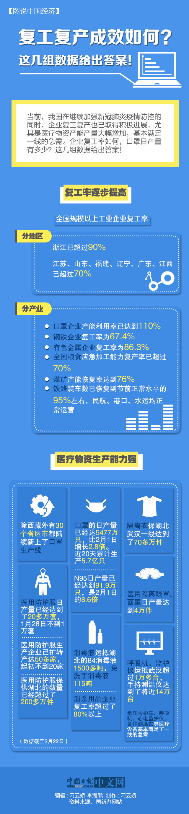当前,我国在继续加强新冠肺炎疫情防控的同时,企业复工复产也已取得积极进展,尤其是医疗物资产能产量大幅增加,基本满足一线的急需。企业复工率如何,口罩日产量有多少?这几组数据给出答案!