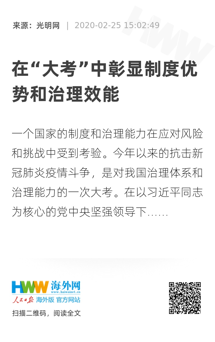 2020年,我国要决胜全面建成小康社会、决战脱贫攻坚。开局之战、开年大考,意义重大、影响深远。应对大考,必须坚决发挥中国特色社会主义制度和国家治理体系的总体优势。依靠我国国家制度和国家治理体系,我们就一定能闯过这一关、打赢这一战,夺取疫情防控的最后胜利,也就可以更从容应对国内外风险挑战明显上升的复杂局面。相信这次决战不仅能全面检验、全面锤炼党和国家抗击重大风险的能力,也将大大增强战胜各种重大风险挑战的信心。