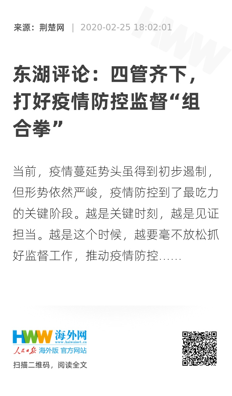 聚焦防控重点,为疫情防控监督划出稳慎“清洁区”。 要坚持疫情防控部署到哪里,监督检查就跟进到哪里,紧扣疫情防控重点工作和重点环节,聚焦主体责任落实、防止疫情扩散、“四类人员”救治、维护正常社会秩序、找不足补短板等方面部署要求加强监督,充分发挥监督保障作用。此外,把履职尽责当做考验责任担当的磨刀石,督促建立联动机制,形成疫情防控监督的强大合力,确保疫情防控监督工作稳妥推进。