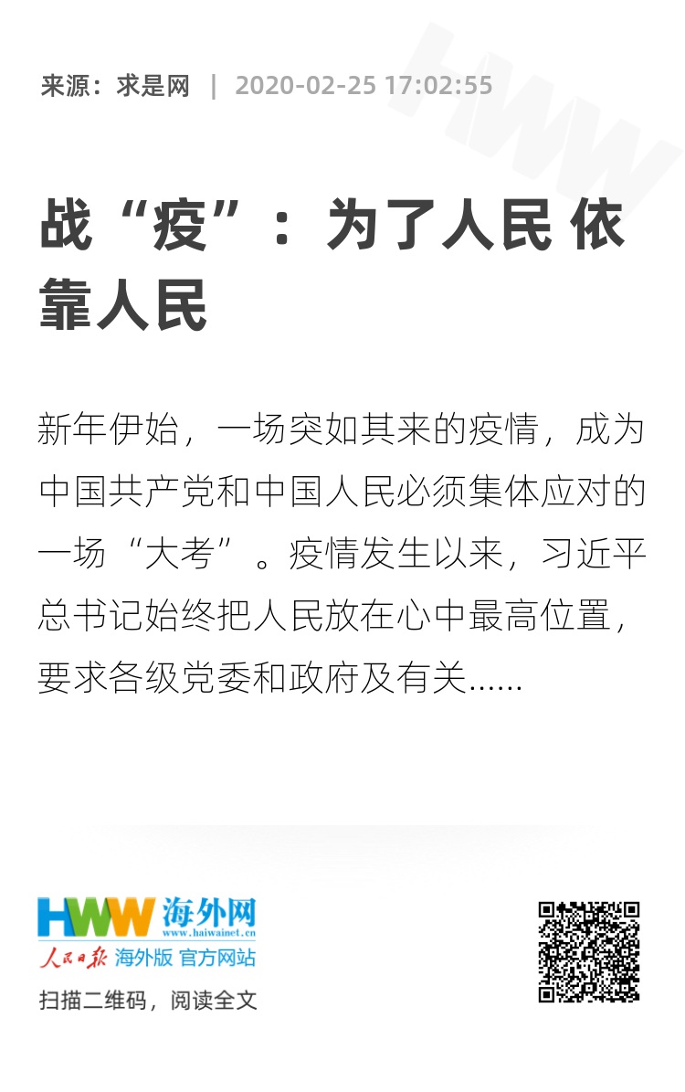 这是一场为了人民、依靠人民的人民战争。危难关头,中华儿女团结一心、同舟共济,心往一处想、劲往一处使,将群防群治进行到底,这就是战胜艰难险阻的中国力量!“我一生中从未见过这种动员。”世界卫生组织总干事谭德塞高度赞赏说,中方行动速度之快、规模之大,世所罕见,展现出中国速度、中国规模、中国效率。这是中国制度的优势。我相信,中国采取的措施将有效控制并最终战胜疫情。