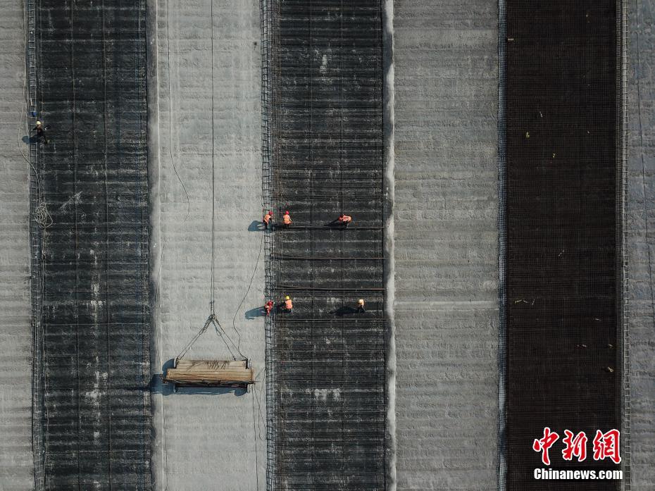 2月25日,工人正在夹岩水利枢纽工程项目大坝上施工。近日,坝址位于贵州省毕节市纳雍县的夹岩水利枢纽工程项目在做好疫情防控的同时有序复工,截至目前,项目复工工作面77个,占总工作面的32.6%。据悉,该工程是贵州省目前在建规模最大水利枢纽工程,大坝高154米、长429米,水库正常蓄水位高程1323米,总库容13.23亿立方米。 中新社记者 瞿宏伦 摄