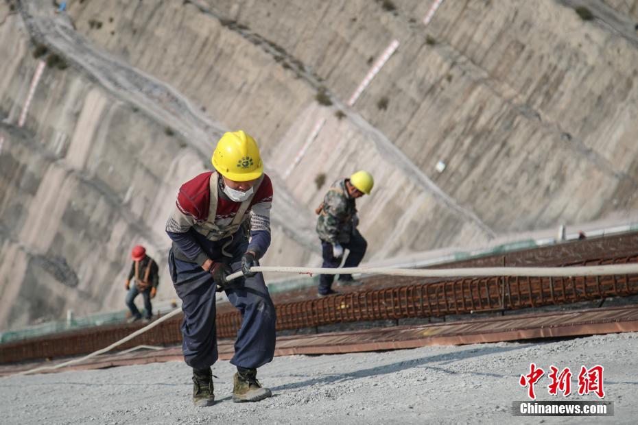 2月25日,工人正在施工。近日,坝址位于贵州省毕节市纳雍县的夹岩水利枢纽工程项目在做好疫情防控的同时有序复工,截至目前,项目复工工作面77个,占总工作面的32.6%。据悉,该工程是贵州省目前在建规模最大水利枢纽工程,大坝高154米、长429米,水库正常蓄水位高程1323米,总库容13.23亿立方米。 中新社记者 瞿宏伦 摄