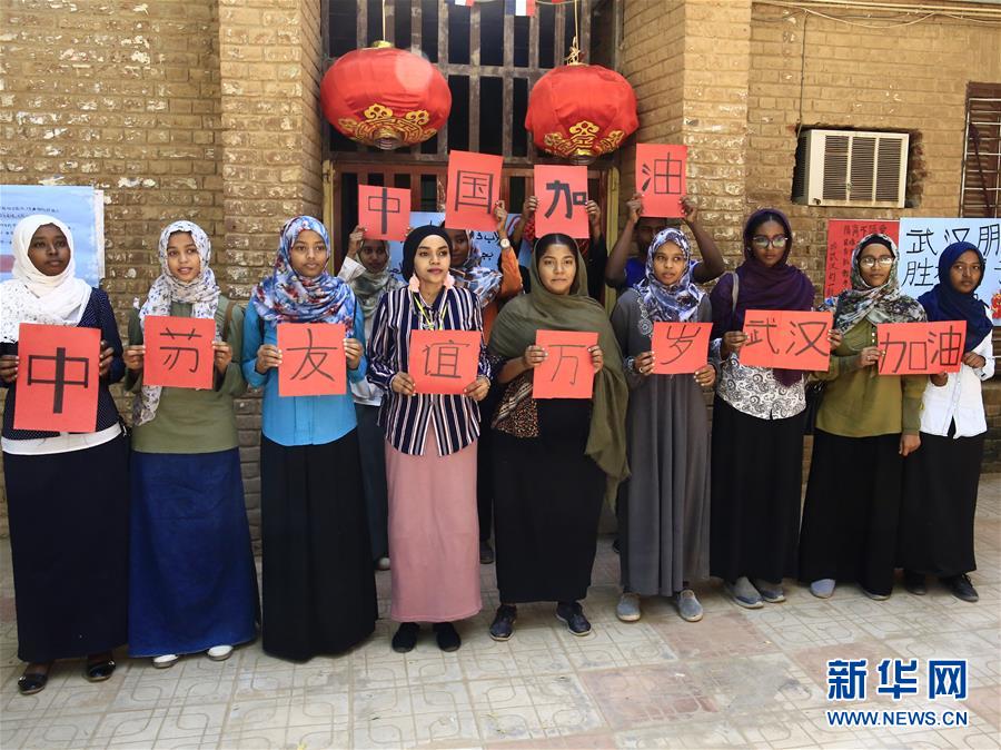 2月25日,在苏丹喀土穆大学,学生们手举标语为中国加油。 当日,数十名苏丹喀土穆大学中文系的学生参加中国文化展览活动,一起为中国抗击疫情加油打气。 新华社发(默罕默德·巴比克尔摄)
