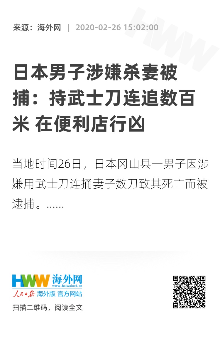 海外网2月26日电 当地时间26日,日本冈山县一男子因涉嫌用武士刀捅死妻子被捕。据称,当天上午,其妻子曾从家里逃出,前往约250米外的便利店求救,但被追到店内的丈夫朝腹部连捅数刀,送医后确认死亡。