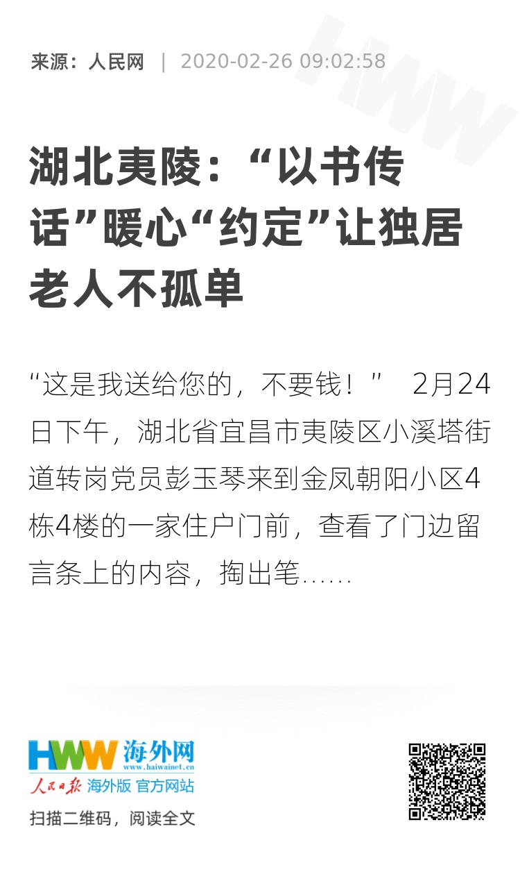 “这是我送给您的,不要钱!” 2月24日下午,湖北省宜昌市夷陵区小溪塔街道转岗党员彭玉琴来到金凤朝阳小区4栋4楼的一家住户门前,查看了门边留言条上的内容,掏出笔写下了这句温馨留言。