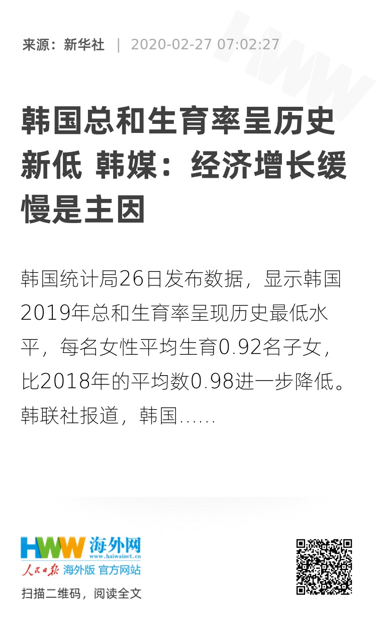 韩联社报道,韩国连续两年总和生育率低于1,显示韩国人口持续减少趋势;韩国目前是经济合作与发展组织(经合组织)成员中唯一总和生育率不足1的经济体。