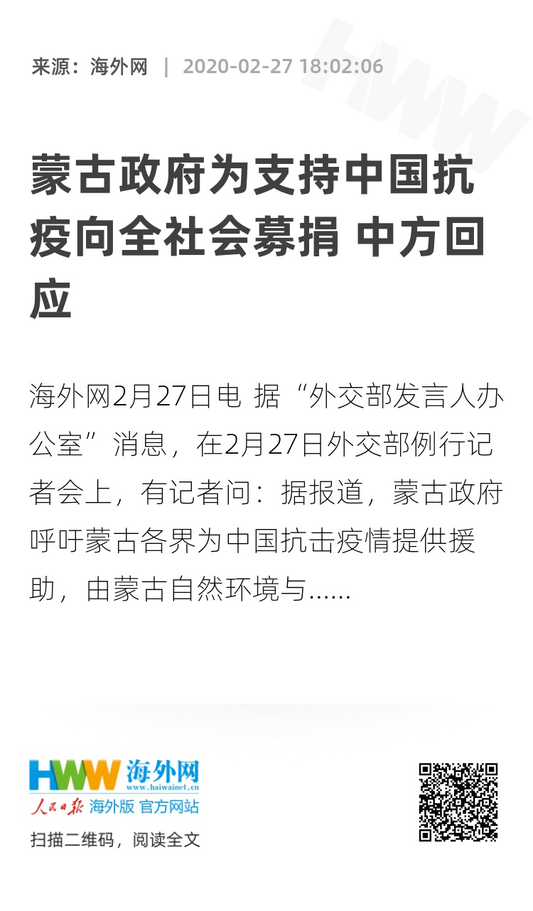 海外网2月27日电 据“外交部发言人办公室”消息,在2月27日外交部例行记者会上,有记者问:据报道,蒙古政府呼吁蒙古各界为中国抗击疫情提供援助,由蒙古自然环境与旅游部、外交部、财政部联合开启“永久邻居—暖心支持”援助中国行动,向全社会公开募集捐款。中方对此有何评论?