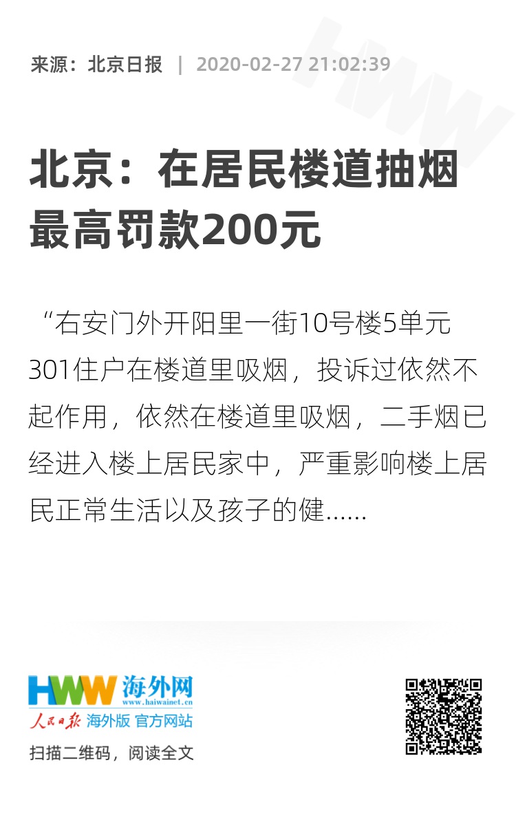 北京市控制吸烟协会会长张建枢表示,居民出了自家门就属于公共场所,楼道属于室内区域。北京市控烟条例规定,公共场所的室内区域是禁止吸烟的。