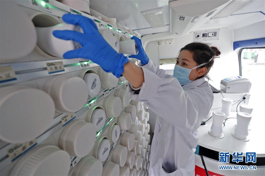 2月26日,在江夏方舱医院的“流动应急智能中药房”里,系统把药方中包含的单味药用绿灯标识出来,工作人员吴志婷将这些盛有单味中药浓缩颗粒的药瓶取下来准备制药。新华社记者 沈伯韩 摄