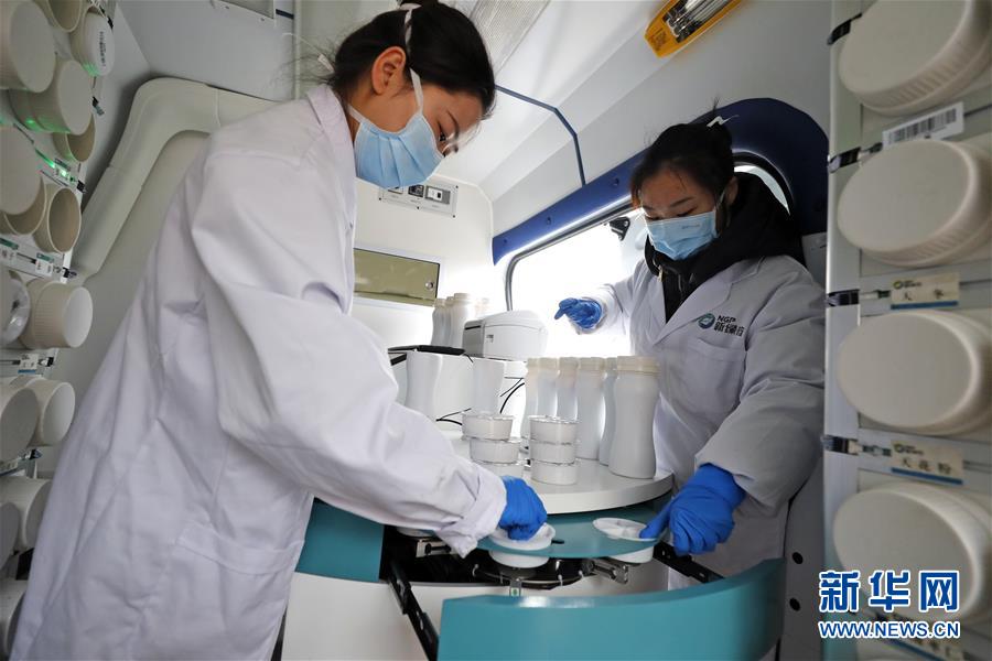 2月26日,在江夏方舱医院的“流动应急智能中药房”里,工作人员吴志婷(左)和王鑫往发药机里放置空药盒。新华社记者 沈伯韩 摄