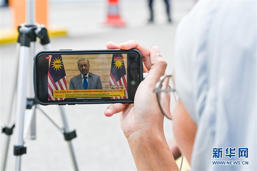 2月26日,在马来西亚吉隆坡的国家王宫外,媒体记者观看过渡总理马哈蒂尔的电视讲话。 马来西亚过渡总理马哈蒂尔26日发表电视讲话表示,如果得到足够支持,他愿意重新担任总理,致力于组建一届超越党派、只以国家利益为重的政府。 新华社记者 朱炜 摄