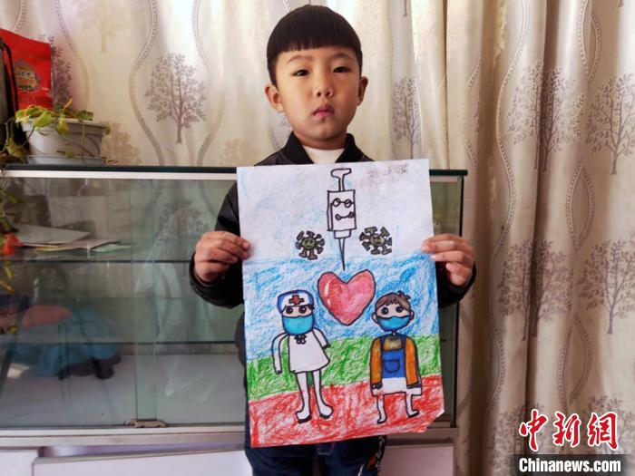 5岁的刘峙滐上幼儿园大班,巴州森林消防支队一级消防士刘广的儿子,绘画为战疫情助力。 孙康康 摄