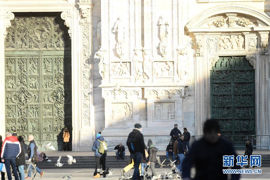 2月26日,在意大利米兰,人们在部分关闭的米兰大教堂前。 针对新冠病毒疫情发展形势,意大利米兰采取多项封闭措施,减少人员流动。 新华社发(马斯科洛摄)