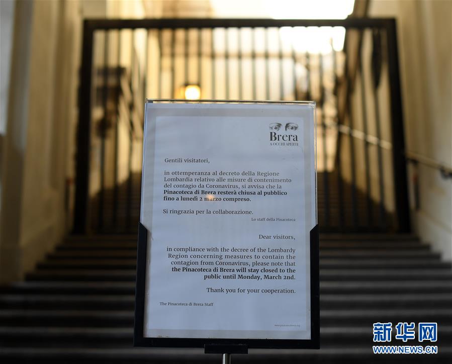 这是2月26日在意大利米兰布雷拉画廊拍摄的暂时关闭通知。 针对新冠病毒疫情发展形势,意大利米兰采取多项封闭措施,减少人员流动。 新华社发(马斯科洛摄)