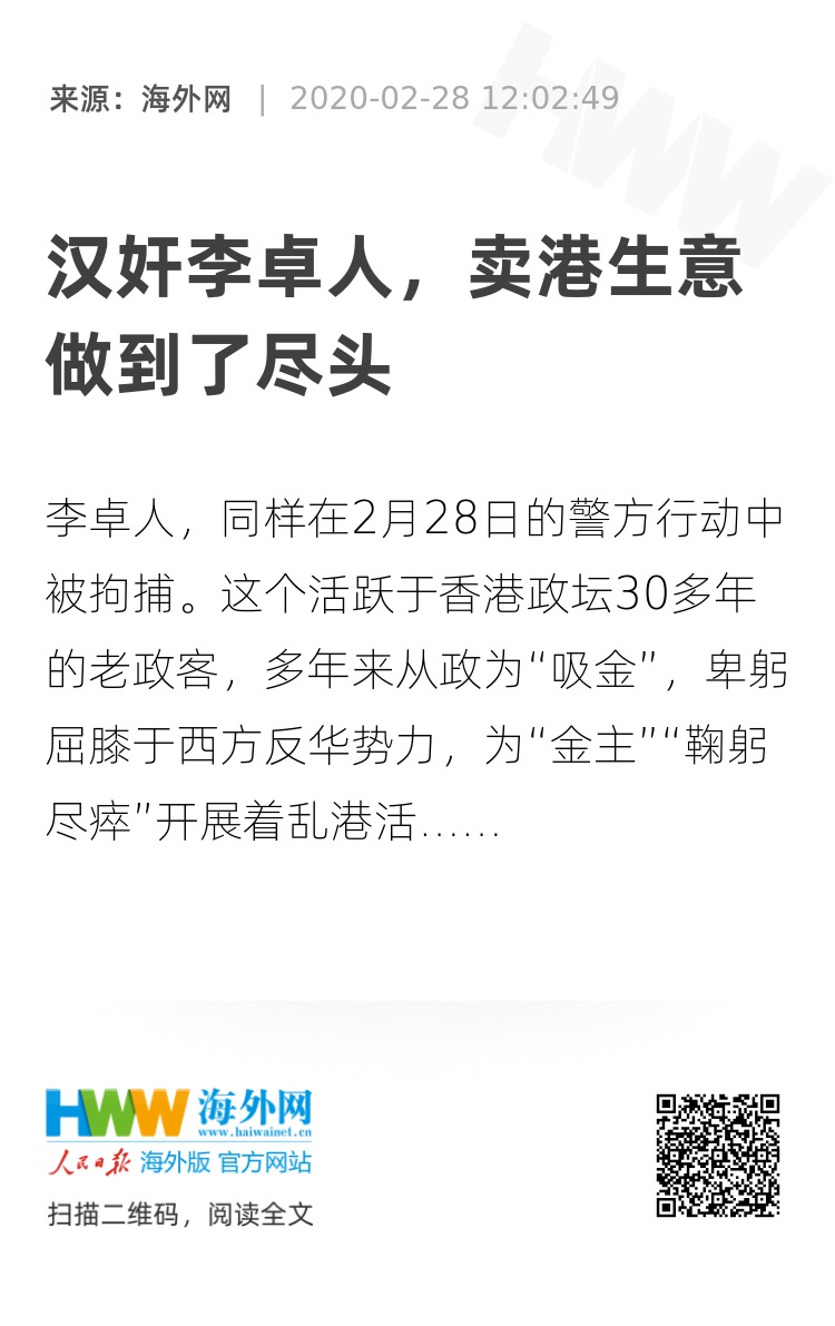 李卓人,同样在2月28日的警方行动中被拘捕。这个活跃于香港政坛30多年的老政客,多年来从政为“吸金”,卑躬屈膝于西方反华势力,为“金主”“鞠躬尽瘁”开展着乱港活动,确属罪有应得。