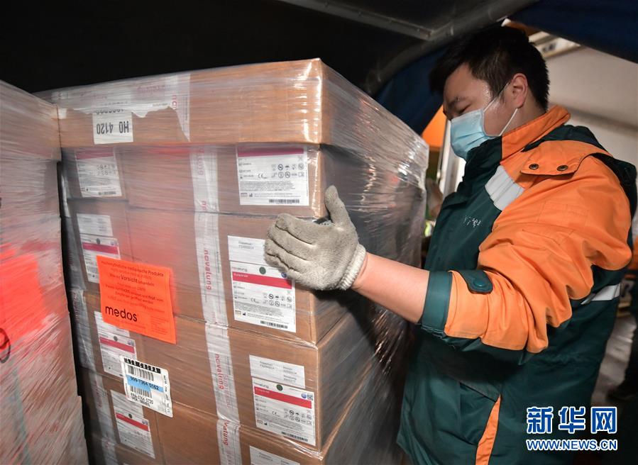 2月27日,装卸人员在武汉天河国际机场将ECMO设备搬上运输车辆。 当日,第二批16台ECMO设备紧急运抵武汉。这是继2月25日从国内调用4台ECMO设备支援武汉后的再度驰援。 新华社记者 李贺 摄