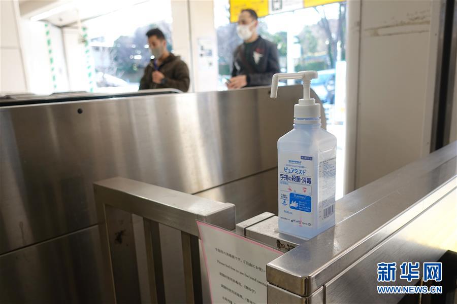 2月27日,在日本东京,上野车站在出入口处放置消毒液供乘客使用。新华社记者 杜潇逸 摄