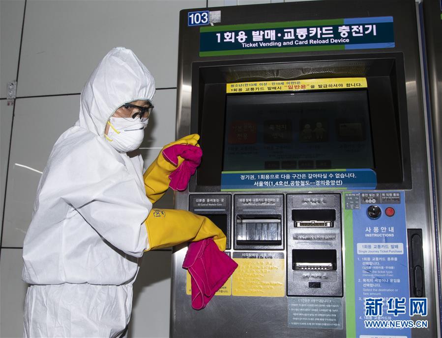 2月28日,在韩国首尔,工作人员在光化门地铁站进行消毒。 韩国疾病管理本部28日发布的统计数据显示,截至当地时间下午4时,韩国较前一日新增571例新冠病毒感染病例,累计确诊病例增至2337例。 新华社发(李相浩摄)