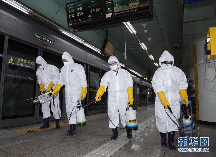 2月28日,在韩国首尔,工作人员在光化门地铁站进行消毒。 韩国疾病管理本部28日发布的统计数据显示,截至当地时间下午4时,韩国较前一日新增571例新冠病毒感染病例,累计确诊病例增至2337例。 新华社发(李相浩摄)