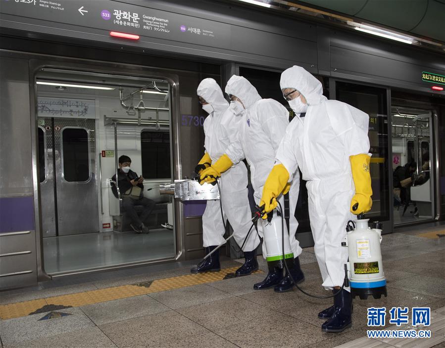 2月28日,在韩国首尔,工作人员在光化门地铁站进行消毒。 韩国疾病管理本部28日发布的统计数据显示,截至当地时间下午4时,韩国较前一日新增571例新冠病毒感染病例,累计确诊病例增至2337例。 新华社发(李相浩摄)