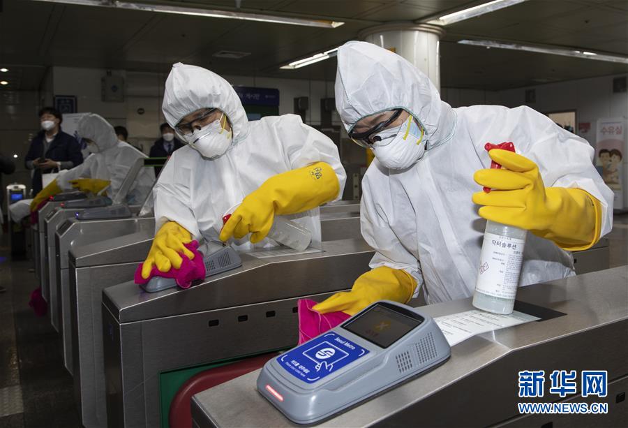 2月28日,在韩国首尔,工作人员在光化门地铁站进行消毒。 韩国疾病管理本部28日发布的统计数据显示,截至当地时间下午4时,韩国较前一日新增571例新冠病毒感染病例,累计确诊病例增至2337例。 新华社发(李相浩摄)