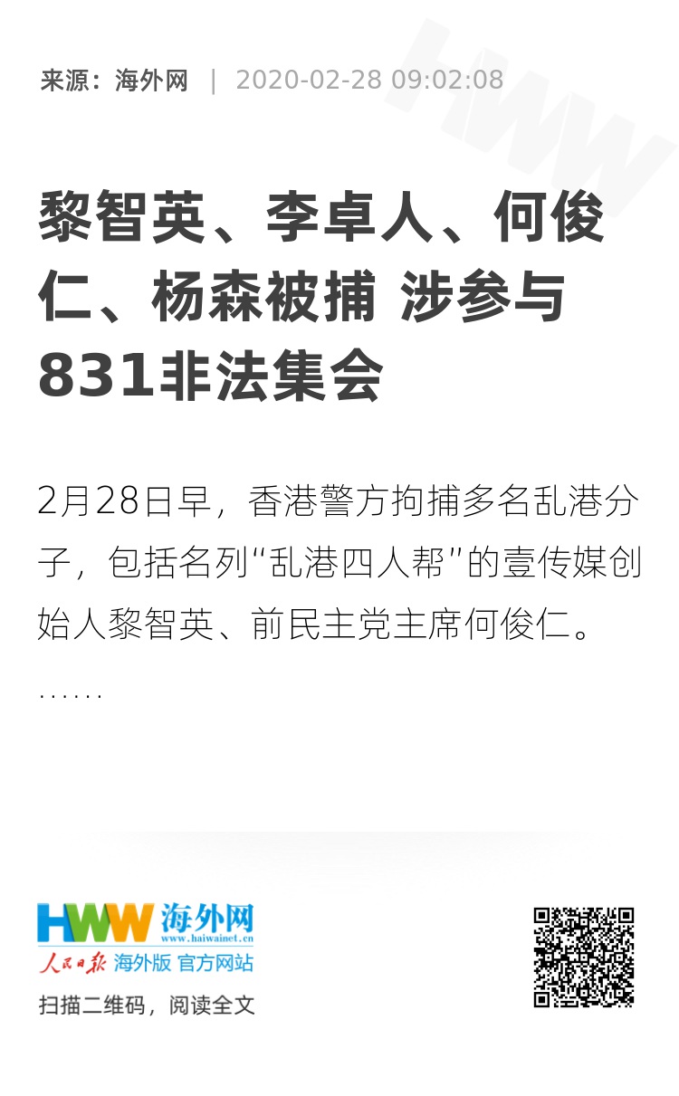 海外网2月28日电 2月28日早,香港警方拘捕多名乱港分子,包括名列“乱港四人帮”的壹传媒创始人黎智英、前民主党主席何俊仁,还有香港民主党前主席杨森、工党李卓人,四人均被指参与2019年8·31非法集结。
